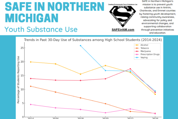 The 2024 SAFE in Northern Michigan Data Brief provides insights into youth substance use trends in Antrim, Charlevoix, and Emmet counties, highlighting decreases in alcohol, tobacco, and marijuana use over the past decade. Additional data shows how youth perceive substance risks and where they access substances like alcohol and vaping products. Data sources included the Michigan Profile for Healthy Youth (MiPHY), Key Informant Interviews, and Youth Focus groups. To review the 2024 SAFE in NM data brief, click here.